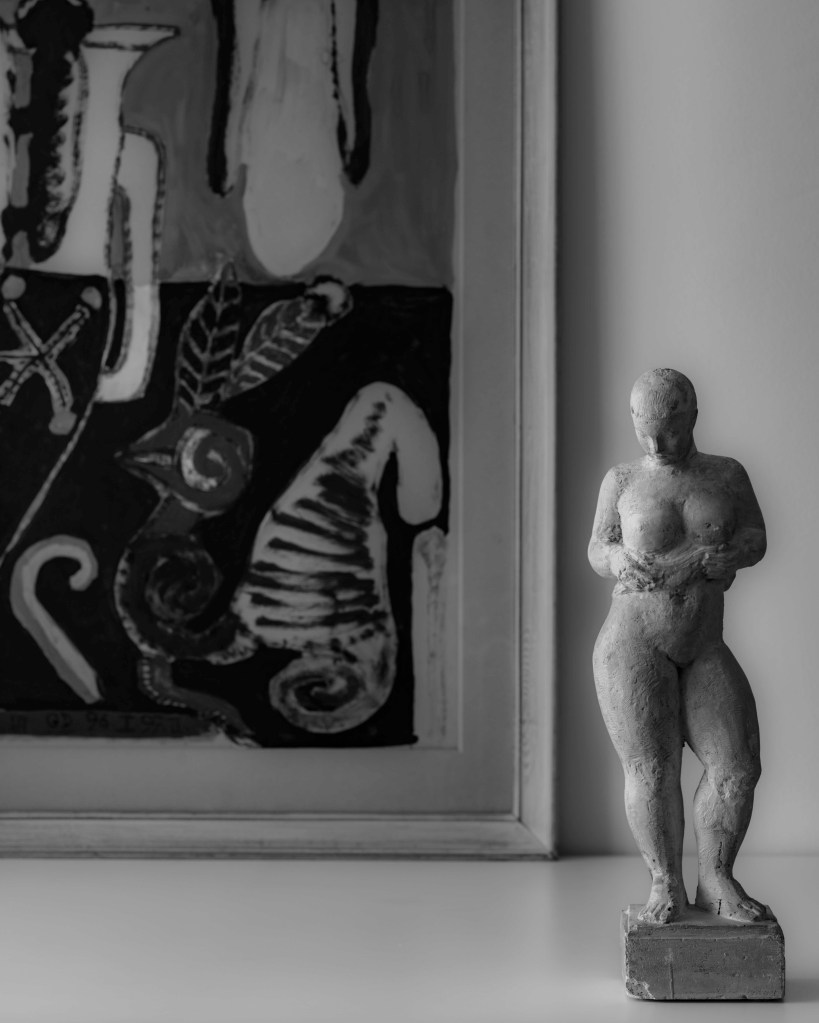 Le plâtre de l’architecte sculpteur italien Aldo Andréani, (1935, galerie Stéphane Deschamps), est terriblement sensuel. Sa silhouette se découpe sur la peinture de Gérard Drouillet ; un monde immense, paisible quiétude de chant de sirènes au fluide qui nous prend au revers. Le noir et blanc succède harmonieusement à la couleur. La lumière ne s’embarrasse pas des détails, la sculpture structure l’image, véritable architecture de la silhouette et transforme l’étude en personnage. #naturemortephotography #sculpture #andreani#peinturre #gerarddrouillet @gillesdalliere