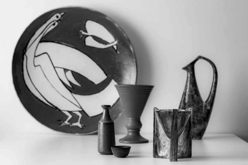 Plat,signée Campos, Romain Ginac Nice. Céramiques 1930 Galerie Anders Hus. Coupe terre émaillée d’York. Carafe terre émaillée, Sacavem Portugal. Sculpture tripode pâte de verre, Etienne Leperlier, Jansen. ©gildalliere, hiver 2026