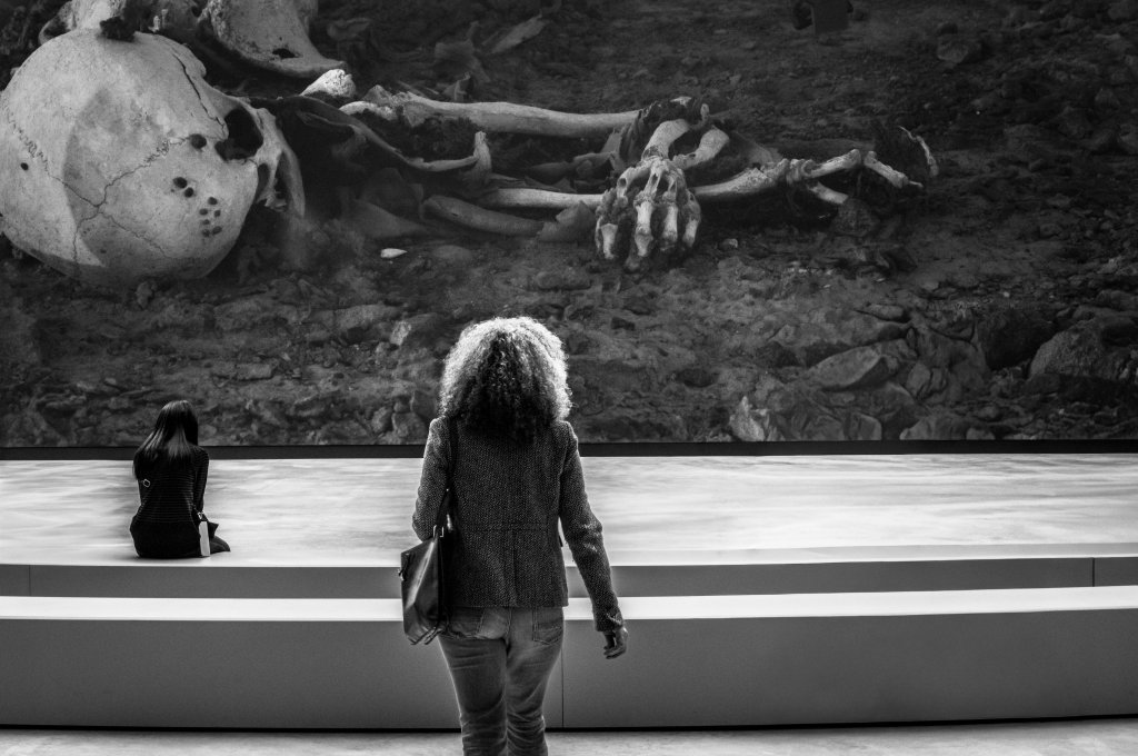 La caméra caresse lentement les os d’un squelette humain, blanchis par un soleil de plomb. L’homme, tombé là, face contre terre il y a 100 ans, est inconnu. Où allait-il, que faisait-il à cet endroit, en plein désert d’Atacama, au Chili ? Personne ne le saura jamais. Oublié de tous, il reçoit enfin, grâce à l’artiste Pierre Huyghe, un rituel funéraire étrange. Dans ce paysage de cailloux à l’infini, où l’air est si pur qu’il s’avère propice aux observations du ciel, des bras articulés en métal déposent autour de la dépouille de petits morceaux de lave noire. Le ton est donné, dès l’entrée de la Bourse de commerce à Paris, et l’espace majestueux de la rotonde. Pleins feux, donc, sur une série d’œuvres qui se la jouent crépuscules, embrassent la nuit, attendent le jour, à l’orée du visible et de l’invisible. #exposition #claire-obscur #blackandwhitephotography @gillesdalliere@boursedecommerce