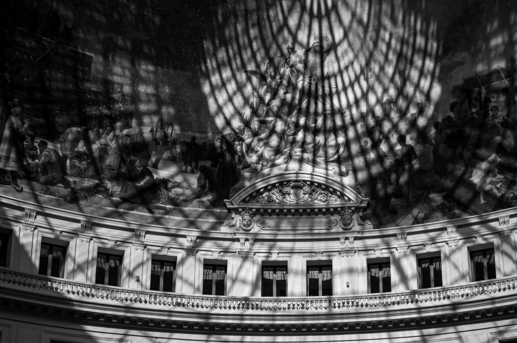 Sous la coupole de la Bourse de Commerce – Pinault Collection, la projection de la lumière sur les fresques participe pleinement à la mise en valeur du programme décoratif. La lumière naturelle, filtrée par l’oculus et la verrière, se diffuse progressivement sur la surface peinte et révèle la composition circulaire des scènes allégoriques représentant les échanges commerciaux et les continents. Cette interaction entre lumière et peinture souligne la profondeur des volumes, accentue les contrastes chromatiques et renforce la lisibilité iconographique de l’ensemble. Ainsi, la coupole ne constitue pas seulement un élément architectural, mais un dispositif visuel dans lequel la lumière agit comme un vecteur de perception, mettant en dialogue l’espace, la fresque et le regard du spectateur. #architecturephotography@gillesdalliere @boursedecommerce
