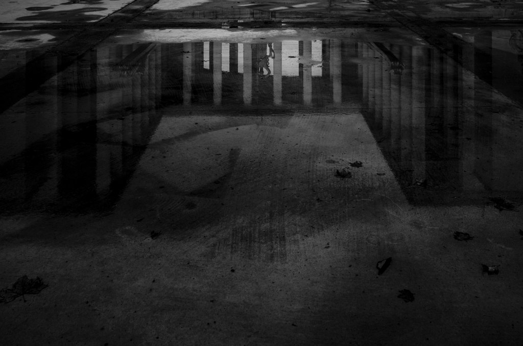 Ce matin, à la lumière d’un jour de pluie, le temps fuit. Je regarde le reflet de l’architecture dans ce qu’il reste d’eau dans le bassin de la fontaine du palais de Tokyo totalement asséché et dans un état de délabrement avancé. Ce matin, je refais le monde, je fuis l’évidence pour glisser sur une flaque d’eau, sur un bout d’espace révélé qui devient le mien.