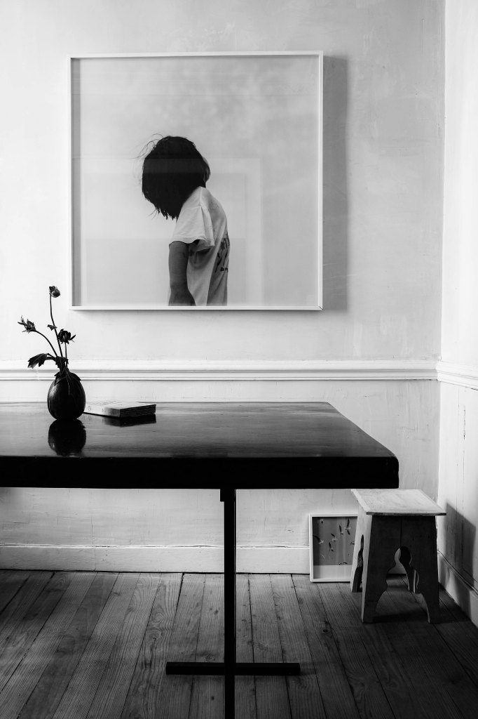 Je ne pourrais pas dire que j’ai vu quelque chose à fond si je n’ai pas cadré une image révélant un tas de détails qui autrement, ne pourraient même pas être discernés. Chez Antoine de Vilmorin, j’ai mis en scène le travail de la photographe japonaise Rinko kawauchi. J’ai saisi pour elle les détails du quotidien qui échappent souvent au trop pressé : quelques fleurs dans un vase, un livre, le reflet dans le laque d’une table vintage, un tabouret voyageur, une photo de la même artiste posée sur un parquet de buanderie. Ces objets font surgir la beauté, la poésie, l’émotion de cette petite fille encadrée qui regarde ailleurs. La palette photographique de Rinko kawauchi, son art de la composition font la part belle aux marges qui ne sont pas sans lien avec la peinture traditionnelle japonaise.