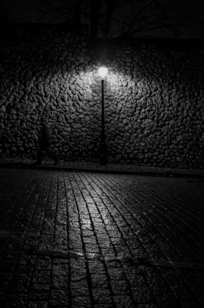 Rue de la Bonne, face au Carmel de Montmartre, il pleut de l’ombre. Le temps s’arrête, le ciel se fige entre les branches des arbres. Quelque chose passe. Est-ce un homme ? Est-ce son ombre où seulement sa trace demeurée-là ? Ce qui frappe c’est ce halo de lumière qui cerne le mystère de la vie. Le réverbère est comme une apparition sortie du noir. Le temps est désarmé, vidé de la pluie qui est tombé toute la journée. Sous la lumière, les pavés résonnent, l’ombre s’échappe, la beauté se faufile le long du mur de pierres dans une perspective inhospitalière. Mais où va le flou ?