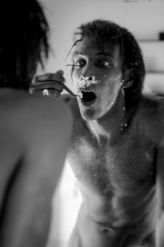 On n’entend pas de bruit, on le voit. Le bruit de l’eau qui coule dans le lavabo, le bruit de la lame, fine et brillante, la voilà, elle crisse, accroche. La poudre de savon qui s’était faite mousse s’en va par bandes. L’onctueuse chaleur du blaireau est maintenant loin. Reste la peau et le bruit de l’âme de cette maison d’hôtes au cœur de Saint-Rémy-de-Provence. La photographie me permet de témoigner du présent, les mots me permettent de récupérer le passé. Tous deux sont un moyen de regarder en moi et autour de moi, de satisfaire ma curiosité. Devant le miroir, le corps est libéré, élégant et il se montre, il s’allonge et se mue en une matière féline face à son image.