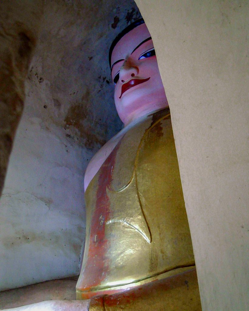 Le kitschissime et gigantesque bouddha de Manuha est serré dans ses murs, coincé. Il rêve, les yeux grand ouverts, de s’évader entre les deux pages d’un livre, sur tant de feuilles déjà noircies, et sur ces feuilles toutes blanches qui ne seront jamais écrites que dans les songes d’un roi, dernier souverain du royaume de Thaton, monté sur le trône entre 1030 et 1057. À l’heure où les matins diaphanes se déplient, il faut monter haut, très haut dans le temple pour apercevoir par la fenêtre de sa chambre, son sourire et sa lumière comme de l’or sur ses paupières roses. S’il pense, je l’entends. S’il bouge, mon cœur bat. S’il parle, je respire l’air qui entoure sa poitrine, et si seulement il me touche, je deviens transparent.