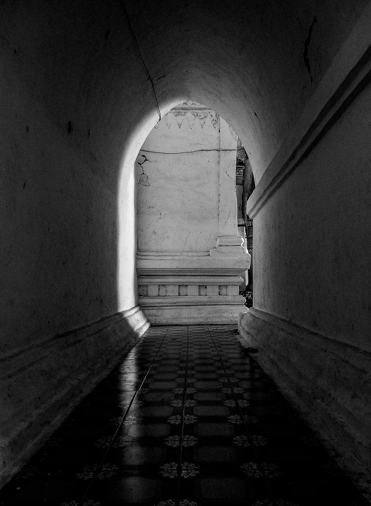 Comme je m’endormais dans l’ombre des couloirs du temple Thatbyinnyu, le bouddha m’a prêté sa lumière. Son visage, blanc de tant de nuit, comme la lune quand elle est ronde, se tourne vers moi. Il me surveille du coin de l’œil. Je presse le pas entre les étages avec plusieurs ombres à mes pieds, nus. Je ne sais malheureusement pas laquelle suivre. Les carreaux de ciment, glacés, jettent sur les traverses leurs motifs par abondance, et l’odeur de l’encens se répand plus clair au fur et à mesure que je glisse. Le grand bouddha est au bout du couloir, à mi-chemin de mon amour et de son sourire.