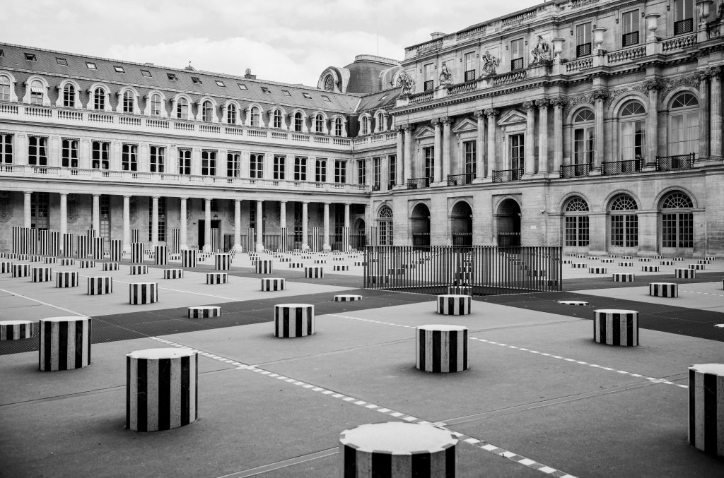 La cour d’honneur du Palais Royal vide. Les Deux Plateaux, l’œuvre de Buren enfin paisible. Voilà une chose bien rare et cela se produit aussi avec les architectures. Il y a les architectures royales, celles qui ont fait l’histoire antique, royale, de l’architecture. Il y a aussi les architectures royales d’aujourd’hui, grandes, sophistiquées, précieuses, précédées d’élaborations technologiques, compliquées, hermétiques. Puis il y a les maisons, les murs, les grilles, les escaliers et les perrons, les fenêtres et les fenestrons, les sols, l’architecture sans histoire et il y a aussi le silence du vide.