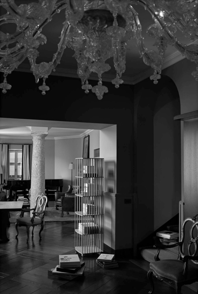 Pour le designer italien, la forme même a sa fonction : apporter la beauté. Dans un univers digne de Luchino Visconti, elle trône au milieu des livres disparates pour mettre en évidence l’ambiguïté de sa fragilité. Dans une cage de hêtre massif, elle enferme quelques titres précis. D’autres fragments de livres sont oubliés. Certains, imaginaires, me font appréhender le monde et le design.