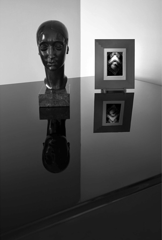Ici, le sens du vide est salutaire. La suppression de presque tout dévoile la vérité du silence. Un jeu de lignes, un clair-obscur, la transparence du laque du Steinway. Tout ça pour mettre en valeur ce bronze en quête d’absolu et le cadre en poirier crée par Gae Aulenti pour le musée d’Orsay. Sa surface en verre est parfaitement alignée au bois permettant une visibilité totale de l’image à l’intérieur : la montée des marches d’un immeuble milanais.