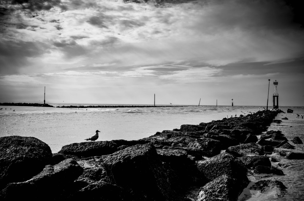 Seul, sur la digue déserte, en ce matin d’été, je regarde du côté de Deauville les mouettes. Le passage tout entier est une mélancolie de roches noires. Et lorsque la rieuse se détache de l’ombre, je m’aperçois tout à coup qu’il s’est ouvert un espace entre la jetée et la plage. Espace réfléchi, blanc, dans les eaux immobiles de la marée descendante et la fraîcheur du matin où j’arrive.