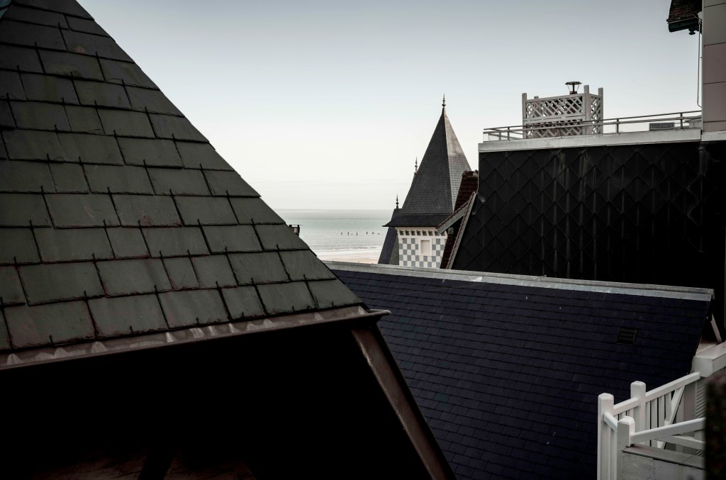 À Trouville, ce matin d’été est un peu frais. Mais la mer est là, loin. Et même si on ne la voit pas, elle est là. Sur la route de la corniche, le gris ardoise encadre ce grand vide, et dévoile peu à peu les pieux noirs. Le ciel est plus clair que le sable, plus creux, plus éclairé. Les toits ont la couleur du silence. Les tourelles d’ardoise désignent la plage d’un geste lent et précis, et les eaux immobiles.