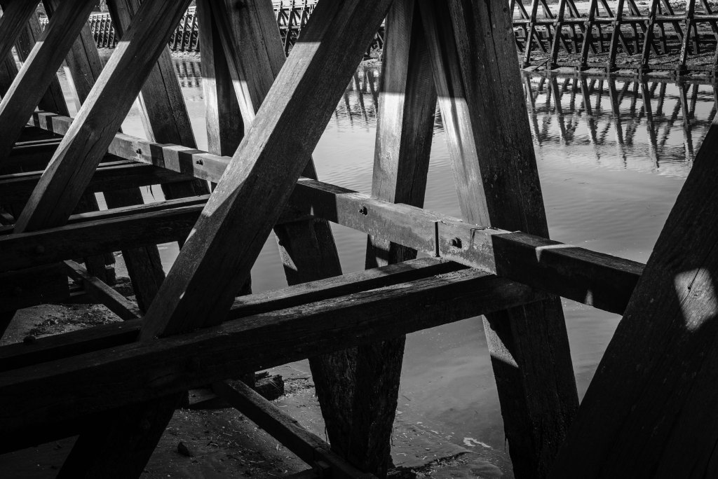 Je retrouve la ligne et l’angle droit, le carré, mais derrière cette rigueur brille le sens des propositions, des intervalles, des pleins, des vides et du rythme. Je suis entré dans le bâti, la verticalité du bâti. Au-dessus, un ciel d’azur est surmonté d’une mouette. Elle offre son jabot blanc au soleil levant. En bas, l’eau de la Touques reflète les géométries de la digue avant de se jeter dans la mer.