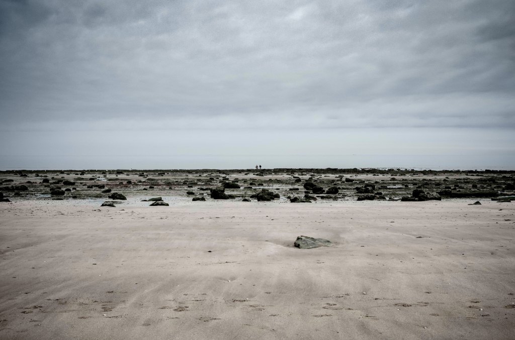 Le jour ne s’est pas levé de la journée. On ne sait pas si c’est encore l’été ou la fin de l’automne. Pourtant ça fait vingt ans que l’on parle du réchauffement climatique, vingt ans qu’on ne fait rien, qu’il ne se passe rien , ou du moins qu’une saison menteuse et sans nom s’est infiltrée entre deux. Elle est apparue, indécise, sur la plage vide, au milieu des roches noires. Au fond, sur la ligne de la marée basse, il y a quand même deux personnages qui se promènent pieds nus dans le bleu laiteux de la mer. Ils marchent vers le large, vers Le Havre. Derrière eux, la nouvelle saison, le silence et le vide.