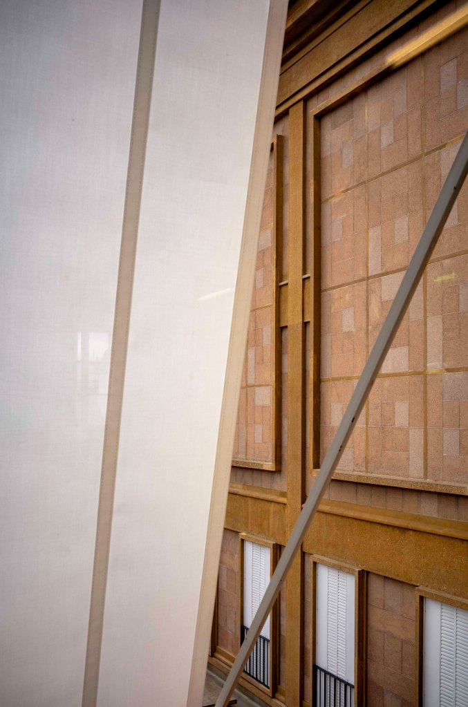À travers la fenêtre de l’atelier, port du masque et passe sanitaire obligatoire, je me suis mis à aimer ce béton corrodé, ces lignes géométriques où s’attarde la lumière des ombres, le store blanc baissé, la poussière du soleil sur les meubles et les luminaires des années 1930-1950 superbement restaurés. J’aime l’élégance de l’ordonnance des bâtiments posés en carré autour de la cour d’honneur fermée par une colonnade, le tapis rouge d’Emmanuel Macron, les variations de textures, les couleurs d’agrégats et les badigeons colorés. Le clou de la visite : le drap mortuaire du retour des cendres de Napoléon Ier en 1848. C’est aussi ça le Mobilier National.