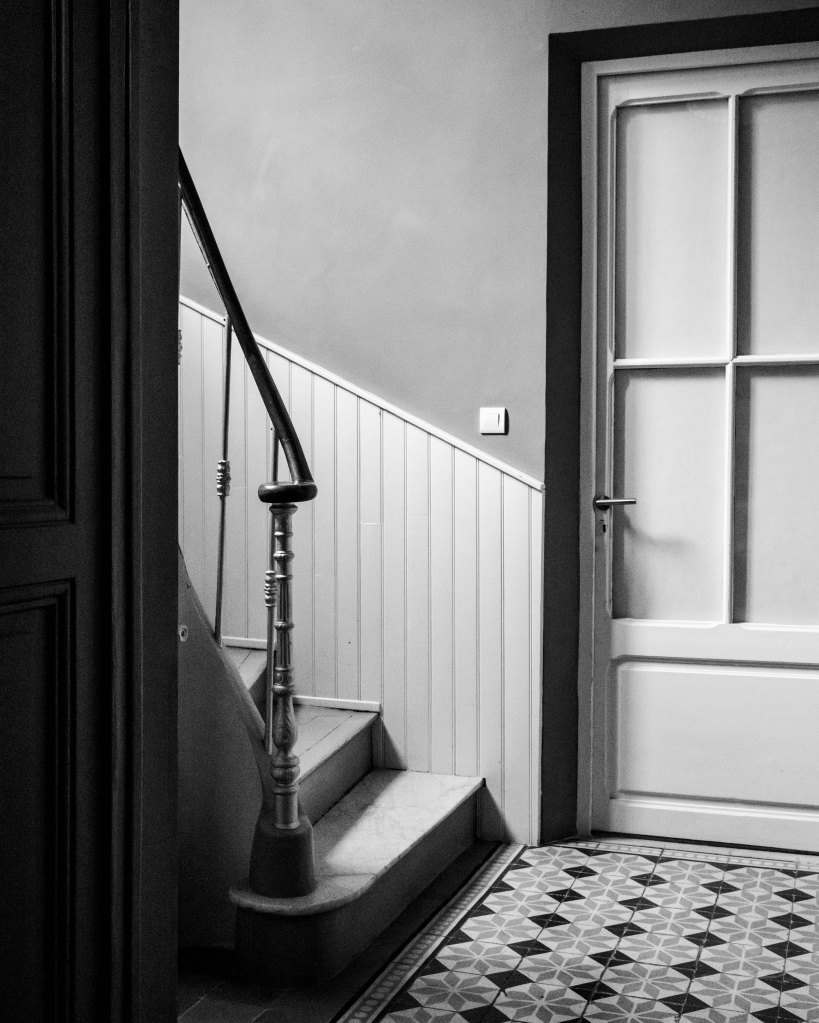 C’est une photo sans fards, un Rembrandt-Soutine sans peinture, une crucifixion sans croix. À peine (mais c’est l’à peine qui fait la force de l’image), peut-on lire ainsi tel détail de la rampe ou du sol en ciment, le tout surplombé par la croix que dessine la structure de la porte.