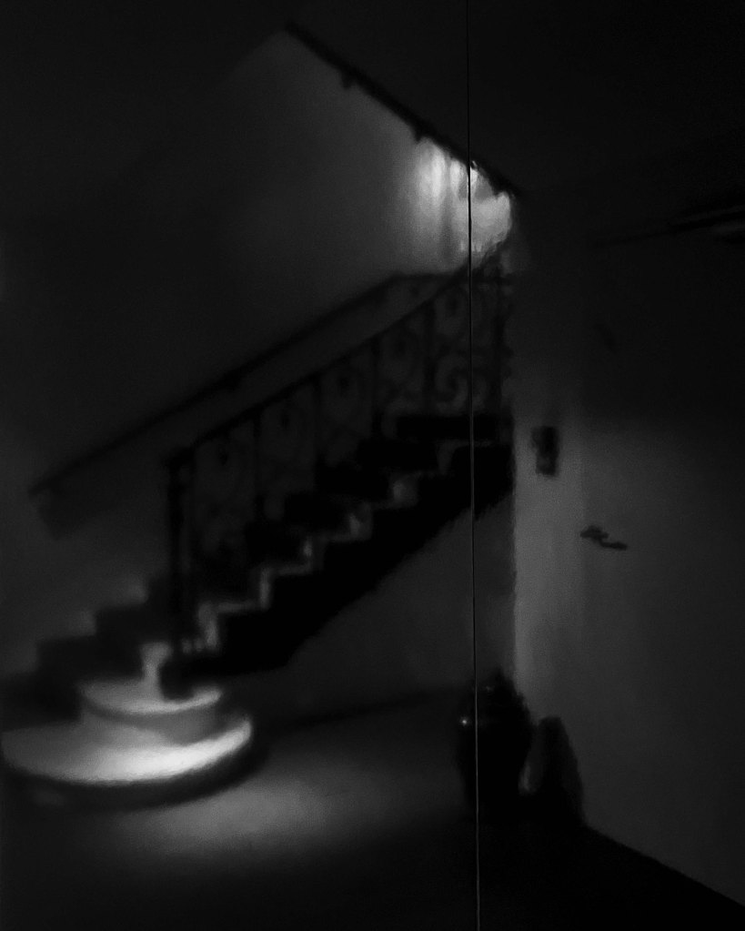 Un rendez-vous, une rencontre, l’escalier d’honneur de cette prestigieuse maison d’architecture intérieure se reflète sur le laque noir de l’entrée. Je parviens à réunir en une seule et même image une présence intense et une profonde sensation de mystère. Voilà comment on construit des histoires en imaginant l’improbable, à la recherche d’une émotion que j’ai bien trouvée là-bas. L’escalier est hors du réel et hors du temps, comme s’il se situait bien au-delà de la beauté.