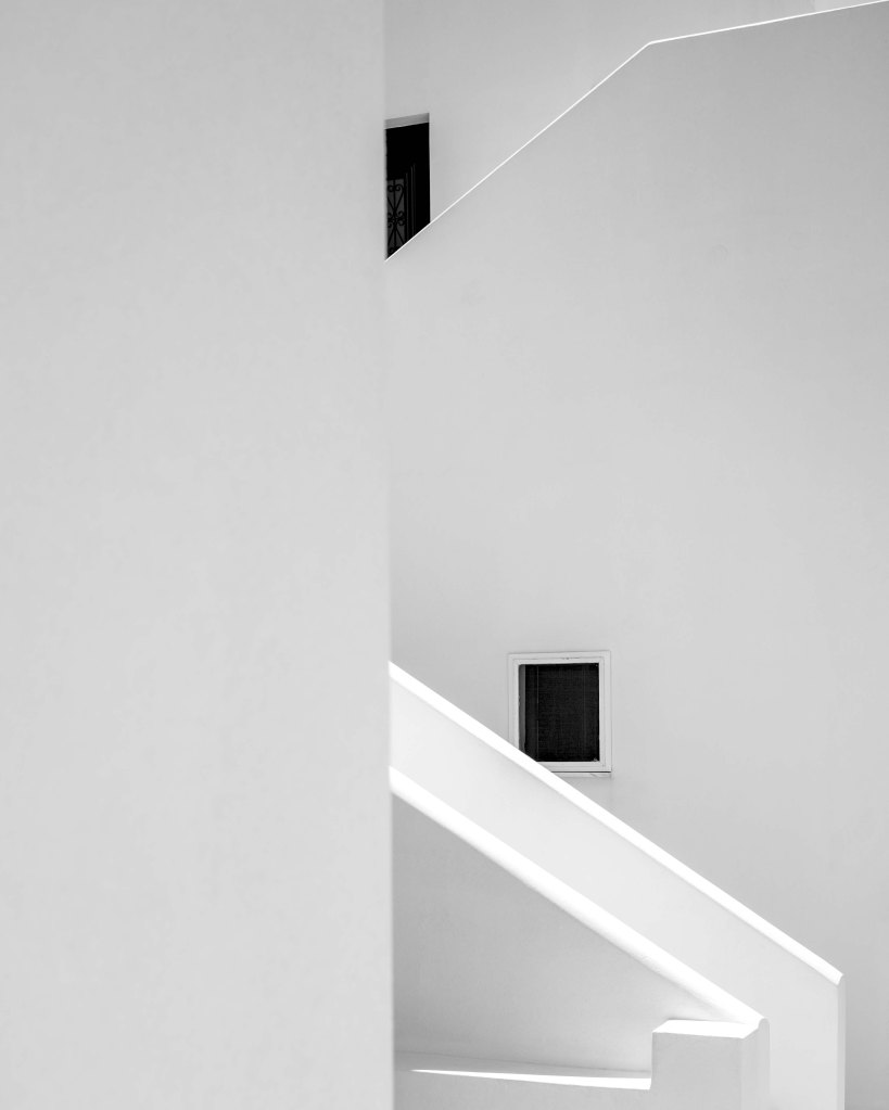 Dans tout ce blanc graphique, le bleu du ciel réclame toujours plus de mots. Je m’approche du bord de l’image, le ciel impatient s’agrandit et je n’entends plus la ville. Là où je suis, il n’y a plus que du blanc, des lignes de lumière, le souffle du vent et des oiseaux.