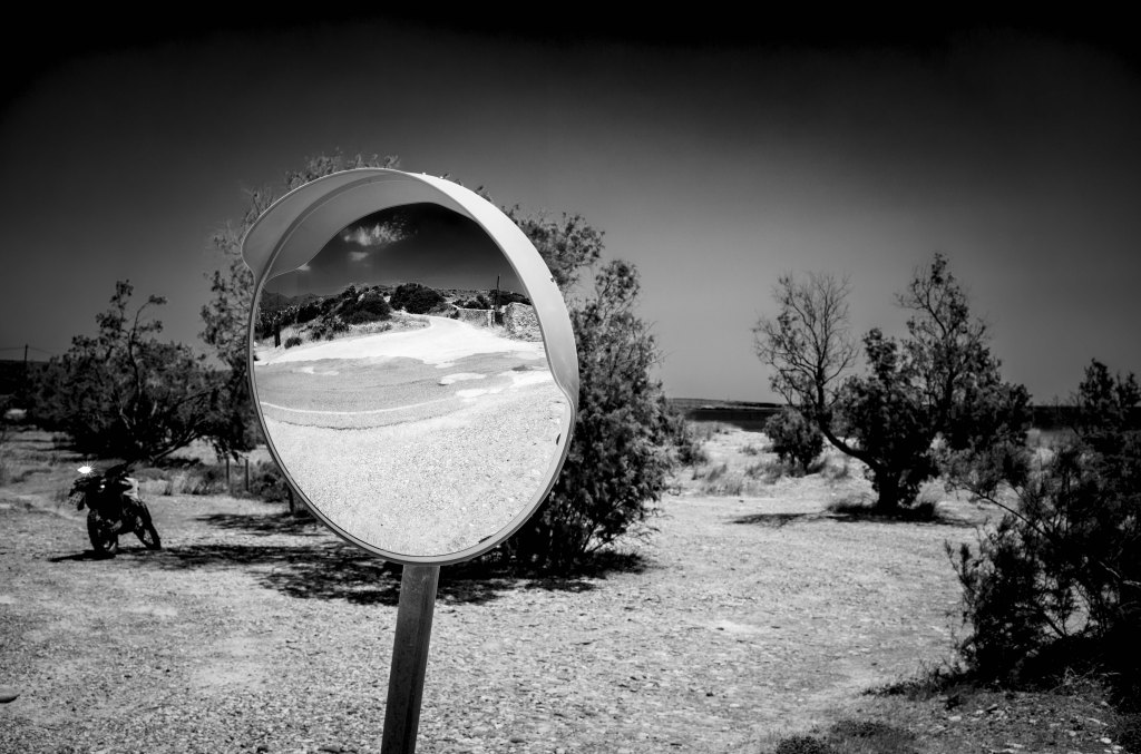 La longue, l’infiniment longue plage est à mes pieds. Le miroir de sécurité, orange fluorescent, brille dans la lumière sans merci, il devient bijou, ou bien mirage. Devant moi le rétroviseur d’une moto d’un bleu métallisé réfléchit au point qu’on ne peut pas le regarder. C’est août, la lumière tombe d’un seul flux terrible, et partout au-delà de la route je vois un paysage dénaturé par l’été, un grand herbier hirsute, jaune et blond qui crépite et attend le feu.