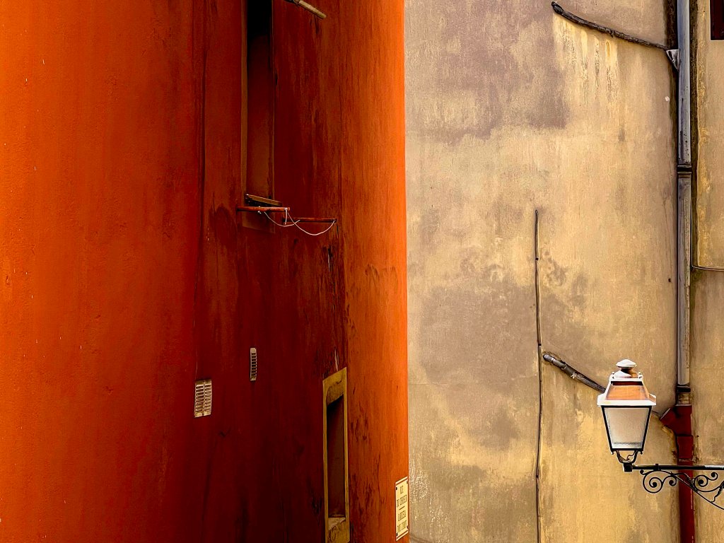 Dans la vieille ville polychrome, je rentre dans le vif de la couleur, rouge antique, ocre jaune, rose ancien, bleu fané ou vert de gris, toutes soulignées de trompe-l’œil, « a fresco », caractéristique d’une véritable communauté de culture à la fois alpine et méditerranéenne. Dans tout ce rouge « sarde », l’azur disparaît sous les bandeaux et les frises linéaires de style Néo-classique et Art-nouveau.