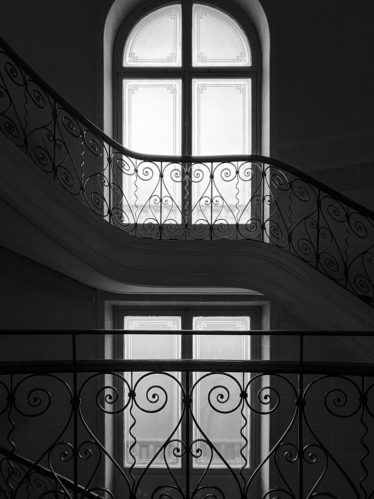 C’est une photographie silencieuse, mais tant de silence fait tout un vacarme. Les ombres et la lumière capturée par la fenêtre s’enveloppent d’une infinité de dégradés et c’est bien ça l’élégance. Ici, aucun débordement n’est permis. La beauté se faufile le long de la main courante.