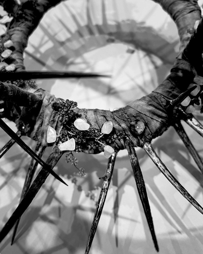 Chez Marie-Paule Pellé, dans la vitrine de la galerie POOK, je touche des yeux la plus acérée des épines d’acacia des couronnes de Philippe Beaudoin. Un jeu d’amalgames, de superpositions, et de références imbriquées, conçu avec un grand sens de la spatialité. Les éléments de structure sont pleinement recouverts par d’abondantes parures qui évoquent les Mille et Une Nuits. Un sens aigu de la couleur ainsi que la préciosité des effets de tissus, mêlant les inspirations orientales et historiques en font une création d’une grande modernité. Jusqu’au 3 janvier, 15 rue du Pré aux Clercs, 75007 Paris #sculpture #art #couronnedepines#symbolesacré #ornementationtextile#ornementationbrutaliste #creationartisanale@baudoin_philippe @mariepaulepelle#blackandwhitephotography @gillesdalliere