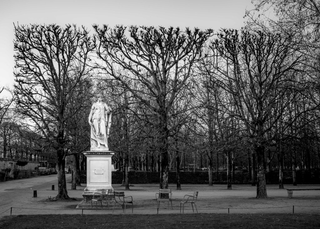 Je suis seul, je regarde les chaises vides, les allées vides. La nuit va nous séparer, Flore Farnèse, sur son socle d’albâtre, veut finir son ouvrage avant la nuit. Alors je m’assieds et reste là à écouter le sifflement des oiseaux. L’odeur de l’hiver est partout et peut-être n’est-elle qu’un souvenir, mais je peux la sentir encore et la faire tourner dans mes rêves. #gardeninspiration#jardindestuileries#jardindestuileriesparis #art #sculpture#hiver #antoineandré#florefarnese#blackandwhitephotography @gillesdalliere