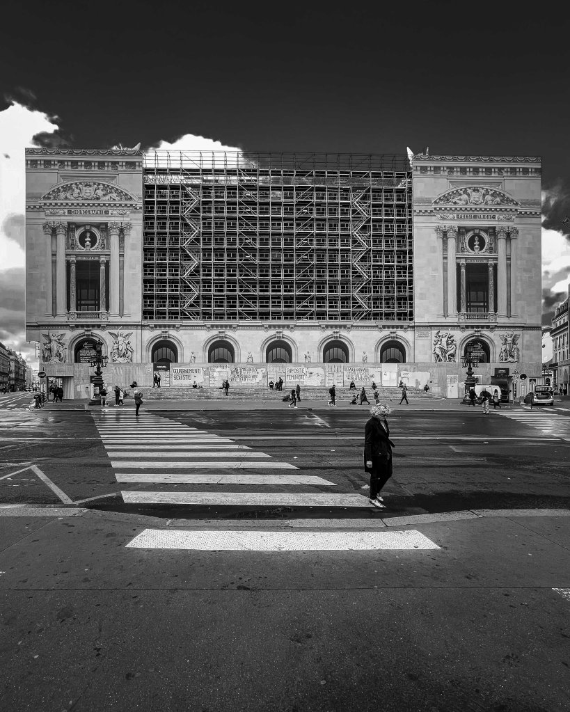 Étonnante vision de l’opéra de Paris le 13 avril 2023, juste avant la manifestation contre la réforme de la retraite à 64 ans. Le bâtiment est méconnaissable, fermé au public, barricadé. La circulation est interdite. On peut y lire sur les palissades : gouvernement sexiste, 40% des femmes ont une retraite incomplète, 45% des mères isolées vivent sous le seuil de pauvreté, riposte féminine, égalité salariale = 6 milliards, la retraite à 60 ans pour toutes. Il n’y en a donc que pour les femmes ? #operagarnier #manifestationparis#reformedesretraites #feministes #travaux#workinprogressart #renovation #tourism#architecturephotography #streetphotography#blackandwhitephotography @gillesdalliere