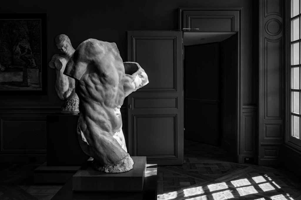 Face à mon miroir, nu, je regarde ce corps d’homme qui n’est ni vieux, ni jeune. Ce corps d’homme brun, c’est moi, ce doit être moi, c’est ce que je suis. Je ne suis pas à proprement parler surpris de ce que je vois, je connais ma taille, ma peau, ma pilosité, elle n’a pas changé au point de me surprendre. Ma peau mate est celle d’un homme qui va au soleil. #sculpture #torse #rodin #hoteldebiron #museerodin#paris #architecturephotography #blackandwhitephotography#leicaedc @gillesdalliere @museerodinparis