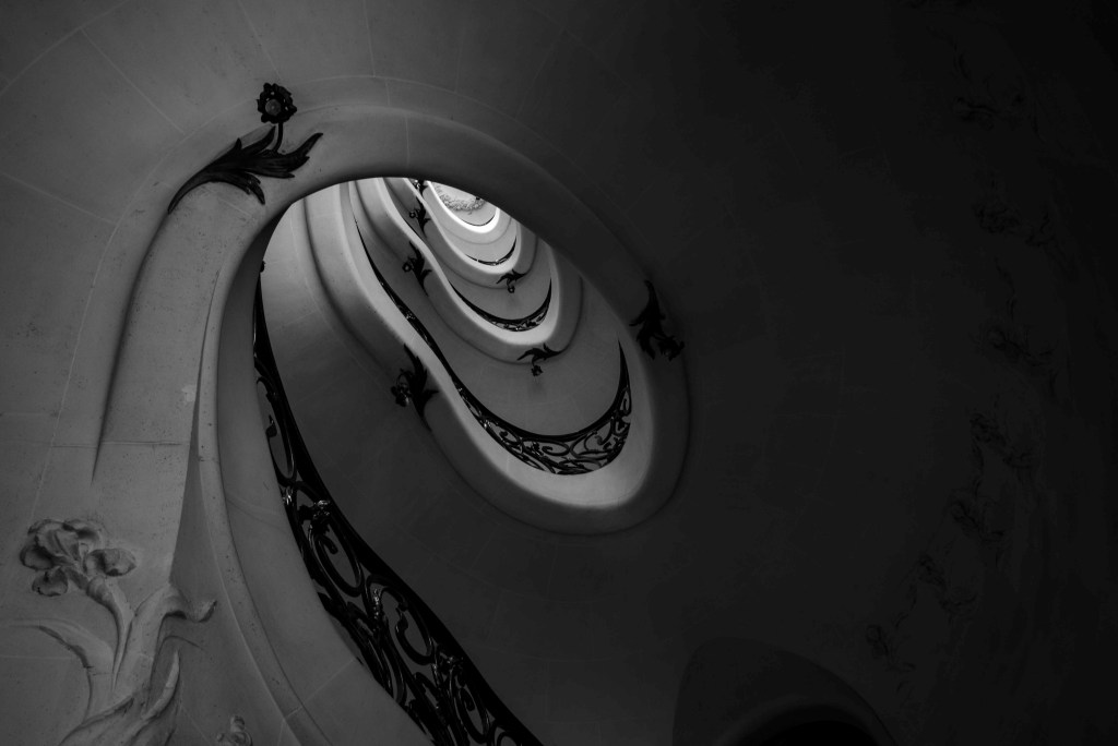 Le trou béant de la cage d’escalier est là, comme un œil ouvert. Sur le palier, Je vois l’ordonnance mystérieuse des iris et les cercles concentriques de la main courante en fer forgé, sertie d’émerveillements. Tout en haut, au milieu de ce théâtre d’ombres, la seule empreinte que je veux laisser sur les murs, c’est ce morceau de lumière, comme une vie hors du temps qui dirait enfin que la beauté est inlassable. #escalier #escalierdesign #1900#lightandshadowphotography #architecturephotography#leicaedc #blackandwhitephotography @gillesdalliere