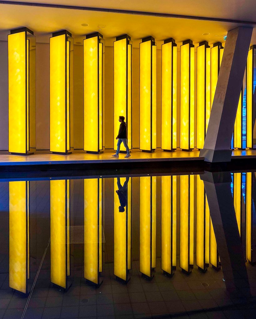 « Si nous pouvions marcher à l’intérieur de notre propre horizon, le monde nous paraîtrait aussi fermé qu’une grotte, aussi réfléchissant qu’un miroir et aussi éphémère que la lumière. Pour moi, l’horizon n’est pas une ligne ; c’est une dimension. Remettre en question son propre horizon, c’est remettre en question la linéarité et se créer un nouvel horizon. » explique Olafur Eliasson. S’aventurer dans l’œuvre Inside the horizon revient à traverser un kaléidoscope de miroitements dorés. Tout au long de cette coursive bordant un bassin, s’aligne une série de colonnes de forme triangulaire et de largeurs variables. Invités à circuler entre elles, les visiteurs activent par leur marche un jeu infini de reflets successifs – l’eau, l’architecture, les colonnes et leur propre image, viennent se réfléchir et se diffracter les unes à la surface des autres. Cet espace ne cesse de se fragmenter et de se dissoudre en mille et une facettes, plongeant le regard dans un univers d’incertitudes et de surprises sensorielles. #fondationlouisvuitton #olafureliasson #art #lumière #horizon#grotte #dimension #insidethehorizon #kaléidoscope #reflet#architecturephotography @gillesdalliere