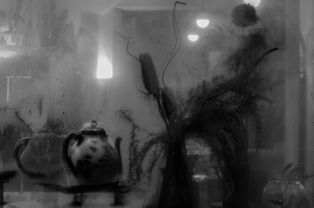 À travers cette vitrine, j’ai cherché à restituer la géométrie insoupçonnée de ces quelques branches lancéolées. Enchevêtrements de lignes pour tracer des ramures aux épaisseurs variées. Sont-elles si près de suffoquer qu’elles affleurent, exhibant leurs cordes variqueuses sur la vitre embuée. Ici nulle réponse à même de poindre, toute piste s’effiloche dans un trouble clair-obscur. Seule la théière effleure la grisaille. #naturemortephotography#vitrine #restaurant #pluie #paris #crepuscule #clairobscure#compositionflorale #leicaedc #leica11monochrom#leicacamera #blackandwhitephotography @gillesdalliere