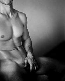 Sa peau blanche est celle d’un homme qui s’est refusé au soleil. Il aime énormément ses mains sortant de l’ombre de son sexe. Il les regarde et les fait jouer. Il a un corps viril sans exagération, il est bien dessiné. Il a les bras très blancs et veinés de bleu, çà et là un grain de beauté ponctue l’uniformité de la peau. Ses épaules et son cou sont assez purs. Il voit le V du sternum plus saillant qui s’ourle sous les battements de sa trachée. Le sexe, il le cache dans sa main gauche, il a l’habitude de le regarder comme une partie de lui et non comme une part de lui. Son sexe, mou, à demi couvert disparait dans l’ombre. Au-dessus, une rature de poils noirs rasés cache la base de la verge et va jusqu’à son nombril. #pose #nuacademy #paris #exercice#blackandwhitephotography @gillesdalliere