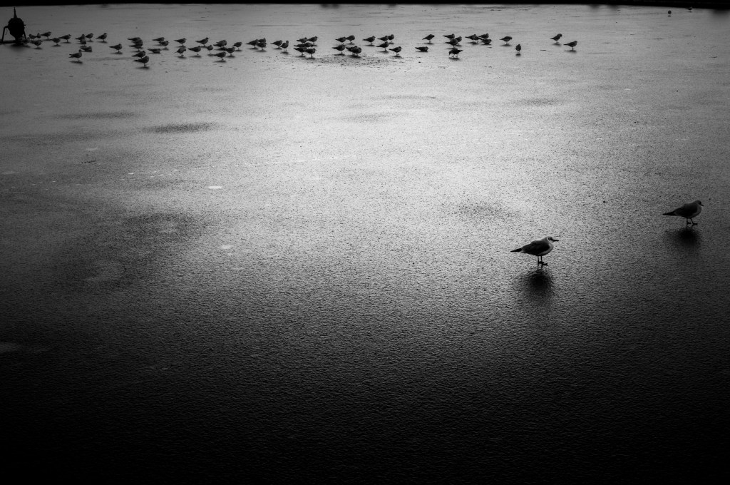 L’hiver laisse sa trace sur le grand bassin octogonal du jardin des Tuileries. La lumière sourde et mélancolique du noir et blanc, les gris profonds et veloutés plongent les mouettes rieuses dans l’ombre d’un monde à part où dominent le froid, l’incertitude, la solitude et l’attente du dégel. L’ombre, on peut la voir, mais on ne peut pas l’atteindre, c’est comme l’horizon. #hiver #winter #paris#jardindestuileries #froid #glace #mouetterieuse #leicaedc#leicam11monochrom #leicacamerafrance#blackandwhitephotography @gillesdalliere