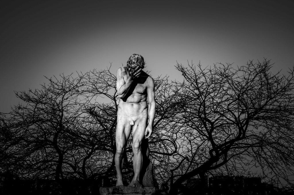 Un socle de pierre, au milieu de l’hiver : c’est là, depuis 1894, que Caïn culpabilise d’avoir assassiné son frère Abel. À mi-ciel, au milieu des branches, il s’est construit un refuge précaire, il ne veut plus quitter le cœur du jardin des Tuileries. Il dort et mange au bord du grand bassin rond, il s’empoussière et s’affaisse. Il y a si longtemps qu’il ne le regarde plus, si longtemps déjà que le jardin avance et monte vers sa réalisation originelle. Il se couvre le regard parce qu’il regrette la mort d’Abel. #hiver #jardindestuileries #sculpture#caïn #henrividal #froid #solitude #tristesse #repenti#leicaedc #leicacamerafrance #leicam11monochrom#blackandwhitephotography @gillesdalliere