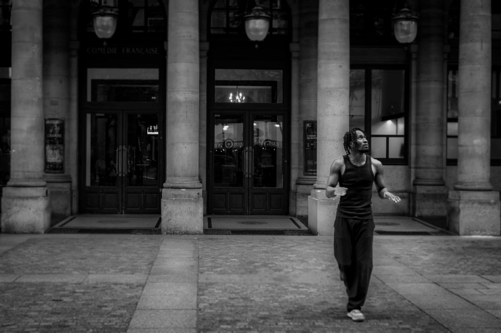 Tout de noir vêtu, Raynal danse dans la rue. Tout commence parfois comme un vague mouvement et l’âme ensommeillée des passants communique avec la profondeur de ses gestes, avec son regard noir. Ses membres s’accrochent, se tordent, ils s’effilochent, s’offrent un peu de repos. Ses bras ont le vertige. Ses pieds se précipitent. Ses jambes s’allongent, elles reculent. Son torse bande ses muscles, ils n’en finissent jamais. Combien de places ? Combien de pavés ? Combien de pas sur les trottoirs ? Combien de milliers d’heures ont raboté ses basquettes pour quelques pièces de monnaie ? #raynal #dancer #artist#comediefrancaise #streetphotography #leicaedc#leicacamerafrance #blackandwhitephotography@gillesdalliere @raynal.gtbs