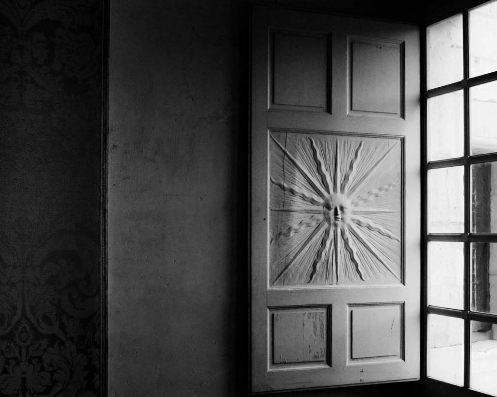 Le soir est tombé d’un coup sur les trésors du château de Chambord. Les colonnes de pierre deviennent brunes, les lustres sont pailletés de reflets d’ombre et un lent crépuscule change la couleur des tentures cramoisies. Il ne subsiste plus que ce soleil sculpté dans le bois d’un volet intérieur qui s’accroche à la lumière. #chambord#chateaudechambord #crepuscule #architecturephotography#blackandwhitephotography @gillesdalliere