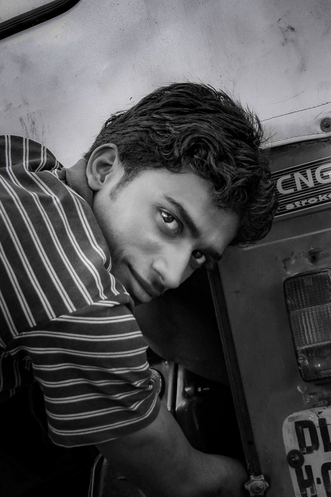 Toi, tu décrasses ton rickshaw. Tu décrètes que la vie est un jeu. La réalité, tu en fais un théâtre, l’éprouvante matérialité, tu lui souris, l’ennuyeuse prospérité du monde occidental, tu la pervertis d’un seul regard. #incredibleindia#india #rickshawdriver #streetphotography#blackandwhitephotography @gillesdalliere