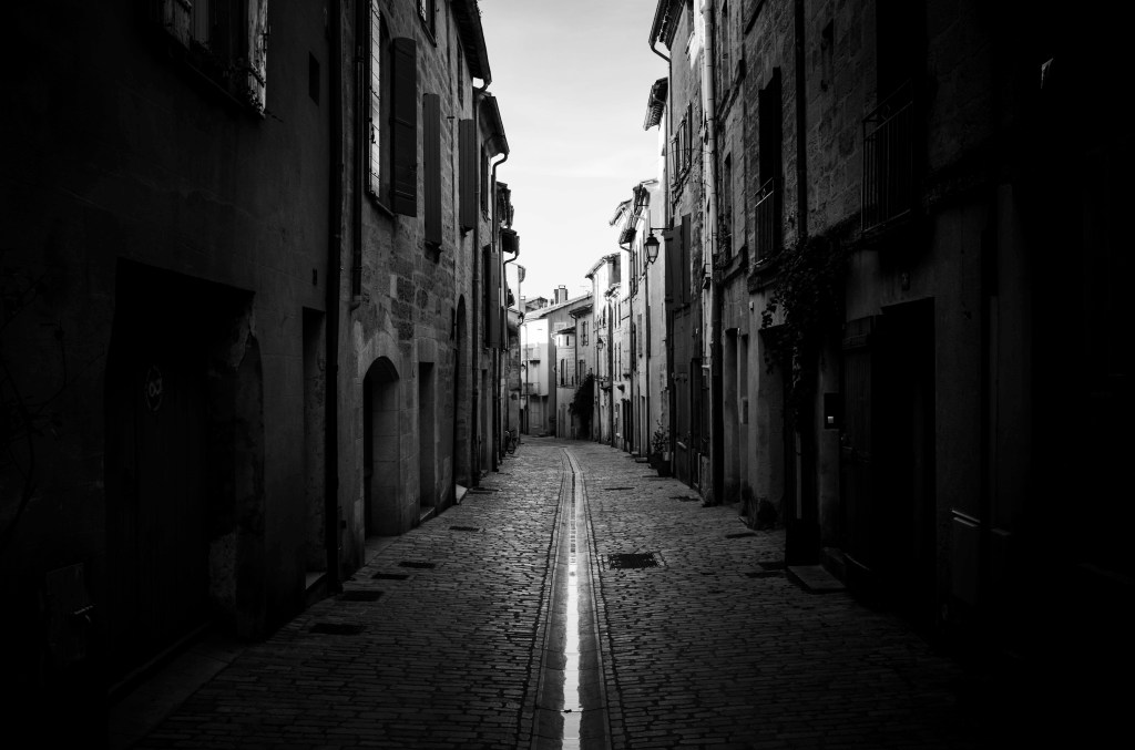 À Uzès, au lever du soleil, la rue de la petite bourgade exploite une gamme chromatique restreinte, dont le blanc est presque absent. Où va-t-il ? J’ai opté pour une image sombre, jouant sur les seuils de la lisibilité. Le seul blanc véritable c’est la rigole des eaux usées qui déchire le pavé. #uzès #ruedelapetitebourgade #architecturephotography#streetphotography #blacckandwhitephotography@gillesdalliere