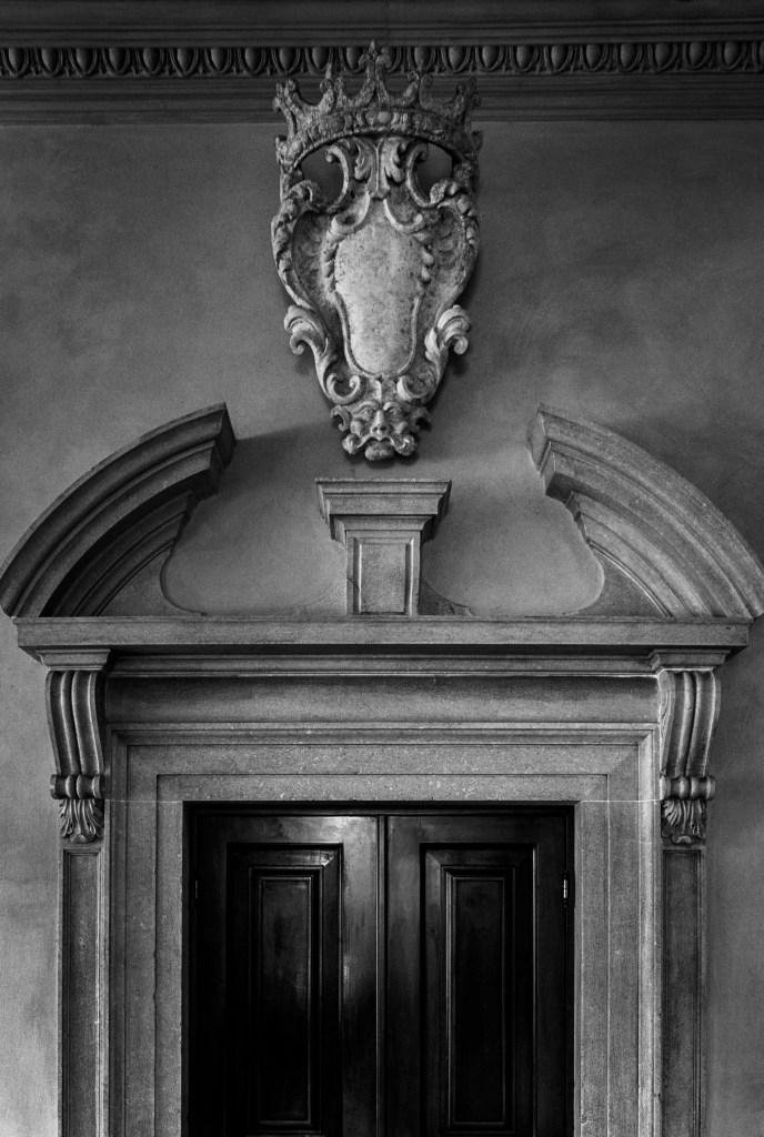 De loin déjà la silhouette de la villa affiche orgueilleusement l’emprise de son propriétaire. Et dès que l’on approche de la façade, on est frappé par l’abondance de son décor héraldique et emblématique. Il timbre la porte principale du bâtiment conventuel. #architecturephotography #blason#decoration #italie #lagodigarda #blackandwhitephotography@francisamiand @gillesdalliere