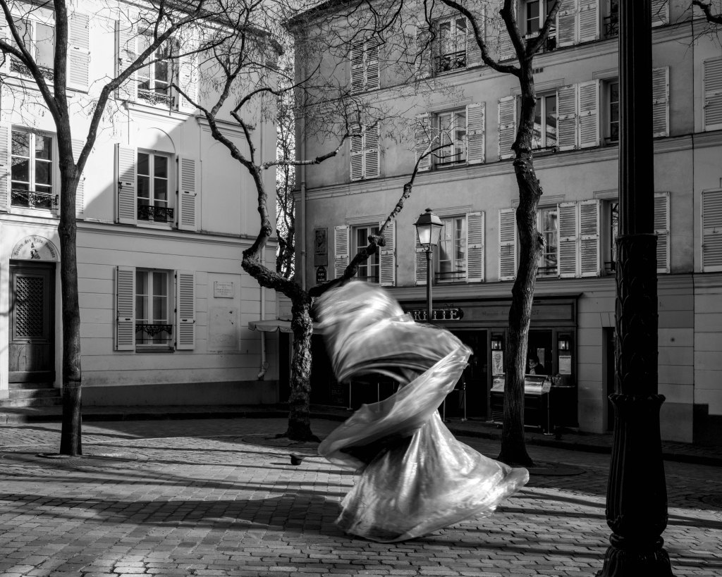 Cette danse gestuelle, place du Tertre, se déroule sur une unique diagonale symbolisant le parcours de vie. Une jeune femme tourne, tourne encore, s’envole. Le phrasé des gestes sculpte l’espace. Elle danse, faisant don de son expressivité et de son énergie. J’ai regardé, scruté, capté. J’ai retenu cette vision du mouvement. C’est en la voyant travailler sur le déséquilibre que mon regard a vacillé. Comment capturer le mouvement en train de s’accomplir ? Comment ne jamais rien figer mais au contraire ouvrir, repousser les limites, en donnant le sentiment d’une incessante mobilité ? Elle s’est livrée à mon regard photographique, révélant chaque fois quelque chose d’unique qu’on pourrait appeler un instantané de l’âme.