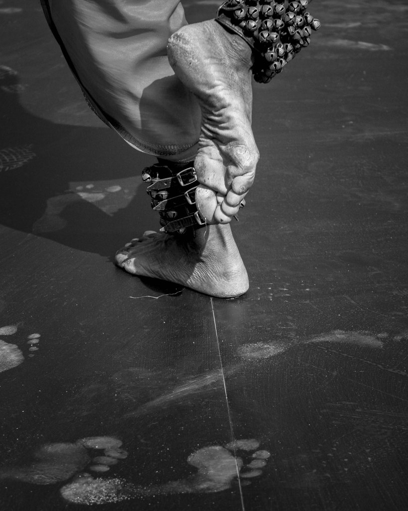 Le silence du crépuscule frémit soudain au rythme des grelots attachés aux chevilles de Raghunath Manet. Je m’incline devant l’empreinte laissée par les pieds du danseur. Je ressens en moi sa lumière dont l’ardente flamme annonce la célébration. C’est lui qui chante l’amour indicible qui de merveille sans fin resplendit dans la chair, dans le cœur, dans l’esprit.