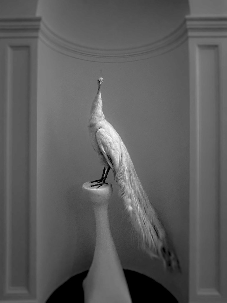 Le paon avec sa toute petite tête haut portée me fixe. Son blanc pur joue sur les seuils de la visibilité, c’est la lumière de l’ombre. Le seul blanc véritable qui parfois surnage face au noir qui dicte sa loi. Le paon est nu, et c’est nu qu’il est ainsi paré. Il résiste en effet, et telle est sa fierté, au discours de l’utile et c’est sans peine qu’il devient l’emblème du luxe. Il ne fait pas la roue mais surgie, fantomatique dans une pénombre qu’il festonne. Il me transporte dans un ailleurs qui a la teneur d’une image vue en rêve. #paon#luxelife#decorationinterieur#homedecoration#goodvibes#dream#blackandwhitephotography@gillesdalliere