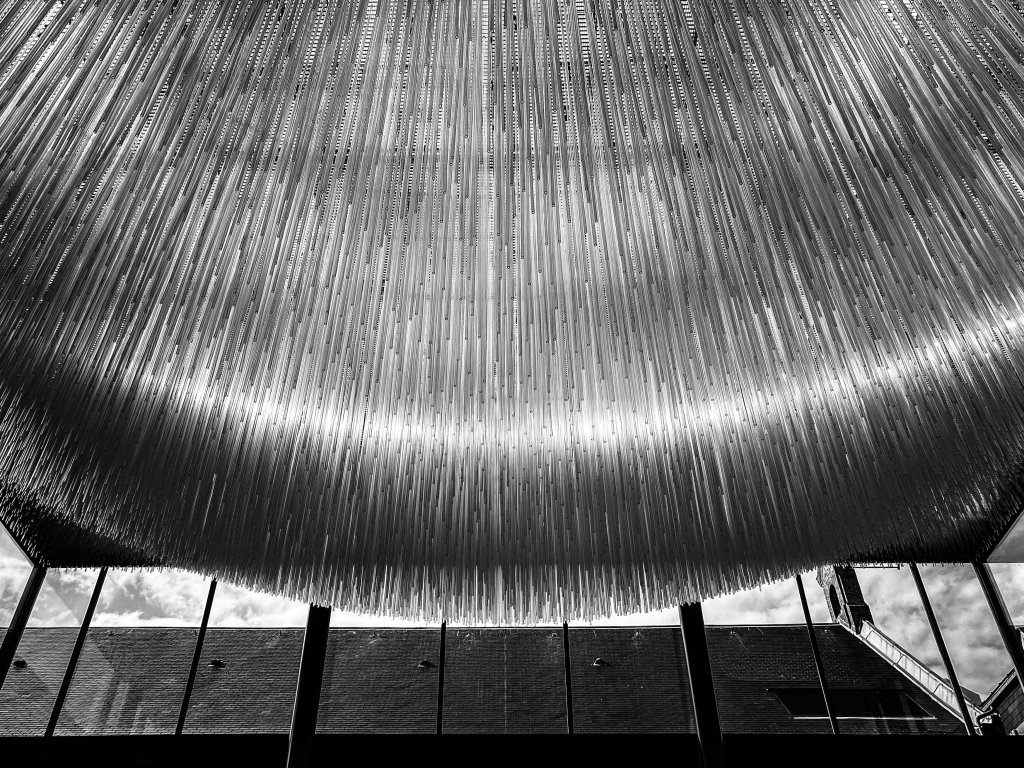 Ce n’est peut-être pas un hasard si l’art de peindre les ciels s’est exprimé le plus souvent en Normandie. Ici, parfois menaçants, mais souvent changeants, les nuages glissent sans cesse pour composer les marines de la côte. Mon regard s’hypnotise sous ce lustre monumental de 400 m², formé d’une composition savante de 14 285 tubes verticaux en polycarbonate ; cette nuée vient homogénéiser la lumière naturelle. Et quand celle-ci s’absente, l’agence 8’18’’ insuffle un jeu de reflets cristallins grâce à 400 projecteurs Palco Low Voltage du fabricant iGuzzini. #deauville#lesfranciscainesdeauville#lustre#architecturephotography#lumiere#nuages#ambiance#atmosphère#blackandwhitephotography@gillesdalliere