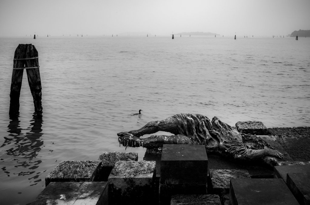 Ici, ce sont les écaillures de la statue « Il monumento alla Partigiana » d’Augusto Murer, qui rendent si vibrant ce ruissellement lumineux : paillettes de bronze, lueurs vertes de mousse, creux blanc de sel, par mille brisures la lumière se joue et se réfracte et s’estompe et s’exalte. Et c’est au miroitement que seule peut avoir une eau calme dont la surface se brise et se crispe en innombrables facettes. #venise #lagune#sculpture #allapartigiana #augustomurer#augustomurerscultore#landscapephotography#blackandwhitephotography @gillesdalliere