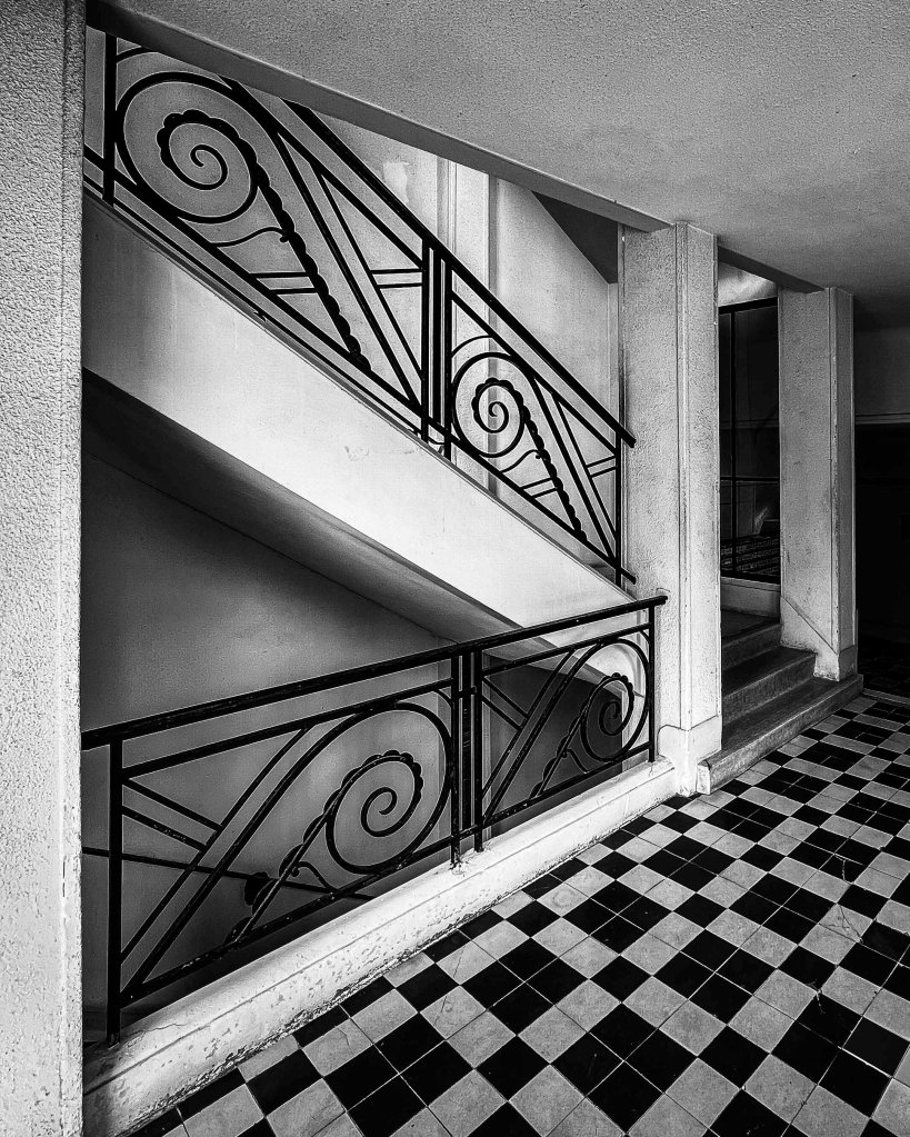 L’entrée vidée de ses meubles est un grand squelette blanchi. II ne reste que la rampe Art-déco installée en 1926. C’est un peu l’architecture du bonheur, ou tout du moins son expression. La résidence Itsasoan et l’Hôtel Guétharia se dressent face à l’océan. Il y subsiste un charme teinté de mélancolie. Reliés par un étonnant pont, l’ancien petit casino et le superbe vaisseau blanc qui se dresse derrière ont perdu leurs fonctions d’origine, mais conservé tout leur panache. #guetharia#entrée#styleartdéco#rampe#escalier#architecturephotography#guetharycôtebasque#blackandwhitephotography@gillesdalliere